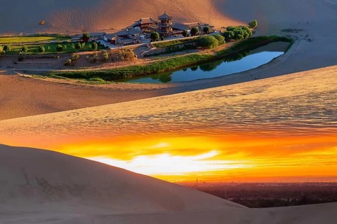 早餐后乘车前往敦煌,游览沙泉共生,泉沙共存的——【鸣沙山、月牙泉】(游览时间约2小时),(如旺季团队从东门进入,区间车需要自理)月牙泉处于鸣沙山环抱之中,其形酷似一弯新月而得名。鸣沙山像一条巨龙,横卧在敦煌城南。山体由流沙堆积而成。它像金子一样灿黄,绸缎一样柔软,少女一样娴静,凤凰一样美丽。【登沙漠山顶】只好手脚并用往上爬,那一道道沙峰如大海中的金色波浪,气势磅礴,汹涌澎湃。极目远眺,天地豁然开朗,心胸顿时开阔,童心不由萌发。下山最为有趣,顺坡而下,只觉两肋生风,一跳十步,驾空驭虚,仿佛有羽化成仙飘飘然的感觉,令人动魄惊心而又玩味无穷。午餐后,乘车赴“西出是阳关无故人的”-赴【阳关】游览时间约2小时,始建于西汉武帝“列四郡,据两关”时期,它凭水为隘,据川当险,与玉门关南北呼应,为汉王朝防御西北游牧民族入侵的重要关隘,也是丝绸之路上中原通往西域及中亚等地的重要门户。古有“西出阳关无故人”之绝句以感慨,更将游客带入驼铃声声的历史场景。