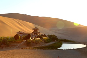 早餐后乘车前往敦煌,游览沙泉共生,泉沙共存的——【鸣沙山、月牙泉】(游览时间约2小时),(如旺季团队从东门进入,区间车需要自理)月牙泉处于鸣沙山环抱之中,其形酷似一弯新月而得名。鸣沙山像一条巨龙,横卧在敦煌城南。山体由流沙堆积而成。它像金子一样灿黄,绸缎一样柔软,少女一样娴静,凤凰一样美丽。【登沙漠山顶】只好手脚并用往上爬,那一道道沙峰如大海中的金色波浪,气势磅礴,汹涌澎湃。极目远眺,天地豁然开朗,心胸顿时开阔,童心不由萌发。下山最为有趣,顺坡而下,只觉两肋生风,一跳十步,驾空驭虚,仿佛有羽化成仙飘飘然的感觉,令人动魄惊心而又玩味无穷。午餐后,乘车赴“西出是阳关无故人的”-赴【阳关】游览时间约2小时,始建于西汉武帝“列四郡,据两关”时期,它凭水为隘,据川当险,与玉门关南北呼应,为汉王朝防御西北游牧民族入侵的重要关隘,也是丝绸之路上中原通往西域及中亚等地的重要门户。古有“西出阳关无故人”之绝句以感慨,更将游客带入驼铃声声的历史场景。