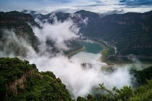 在山西长治壶关大峡谷的幽深秘境之中,隐藏着一处避暑胜地——紫团峡谷与黑龙潭河谷。夏日里,这里的气温比外界低约二十度,宛如一方清凉的世外桃源。紫团山,作为太行大峡谷中的一座巍峨山峰,因其山顶常有紫气缭绕而得名。这座山峰海拔逾千米,不仅拥有壮丽的自然风光,还是道教文化的重要圣地,山上有许多古老的道观遗址。紫团山上古松参天,见证了这片土地悠久的历史。如今,紫团山以其一线天、白云寺、紫团洞、独石桥等自然与人文景观吸引着无数游客前来探访。此外,关于紫团山的神话传说更为其增添了几分神秘色彩。