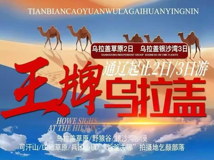 早集合后前往扎鲁特旗“中国最美山地草原”【车览】享有“中国最美山地草原之称”连绵的山川下,连绵的山川下,清澈的小溪在欢快流淌,远处的蒙古包就像飞落的大雁一样镶嵌在草原上,尽赏科尔沁草原风光。水草丰满,空气清新,风景优良,令人舒畅,看着眼前这样一片壮丽辽阔的草原,大家便能够感受到草原带来的非凡魅力了。据悉这片扎鲁特山地草原乃是曾经辽代誉洲古城将士驯养战马的地方,因此也叫作军马场。对于战马的要求有多高,这里的草原环境就有多好,一望无际的平原草场上,最适合马儿无忧无虑的肆意奔跑了。山川和草原只见连绵起伏,独特的自然景观还有人文景观更是令所有观赏的游客震撼非凡,回味无穷。远处苍劲有力的马头琴声伴随着阵阵的清风传来,每一缕音符的似乎也在诉说着历史的故事。午餐后游览【野狼谷景区】赠送玻璃栈道零距离观赏草原狼主要以草原狼为主,这里有 200 亩野生放养区,20 亩小狼驯化基地,这里散养着 38 匹野狼。野狼谷景区饲养的动物还有草原雄鹰、雕、旱獭、大雁、天鹅等。在野狼谷,你可以乘车观赏狼群或者喂食,近距离感受“狼”的习性和文化;后前往【兵团小镇】在乌拉盖草原深处有这么一处镌刻着兵团记忆的小镇,这里保存着兵团时期的建筑,传承着薪火相传的兵团精神,这里就是原内蒙古生产建设兵团六师五十一团团部所在地——乌拉盖哈拉盖图农牧场兵团小镇。走进兵团小镇仿佛让人们回到了那个年代,青灰色的墙体,古朴的门窗,激昂的标语,到处都是属于那个年代的时代烙印,兵团司令部、邮局、兵团礼堂,依稀可以看到那段历史所留下的痕迹。在兵团文化展厅门前的红旗广场上,游客们可以在各式具有兵团文化特色的标语和雕塑前拍照“打卡”。【乌拉盖湖】乌拉盖湖历史文化悠久,旅游资源丰富。水库区具有花草茂盛、天高云淡、景色优美、气候宜人等草原生态旅游特色。天鹅、大雁以及各种水鸟时起时落,库区周围野花遍地,蘑菇、黄花、芍药随处可见,是休闲避暑疗养的最佳选择地。在这里,曾经还拍摄过一部电视系列片《走进乌拉盖河》。影片用史诗般的情景展现了乌拉盖河流域的人文历史、风土人情、自然风光以及当地社会和谐稳定、人民安居乐业的良好局面,让乌拉盖湖名声大震。环湖路游览【在水一方】【金花滩】享有“小九曲湾”之称的参观草原上的季节性河流乌拉盖河,环绕在高尧乌拉山脚下,河北岸湿地草原平坦如画,河南岸怪柳丛生幽深恐怖,游客到此无不止步。乘车前往“爸爸去哪儿”拍摄地【乞颜蒙古部落】到达景区,接受草原的迎宾礼,感受草原的最高礼节接受蒙古人款待贵客的最高礼节--【草原迎宾-下马酒仪式】敬献下马酒,奉上蔚蓝的哈达,欢迎远道而来的客人。