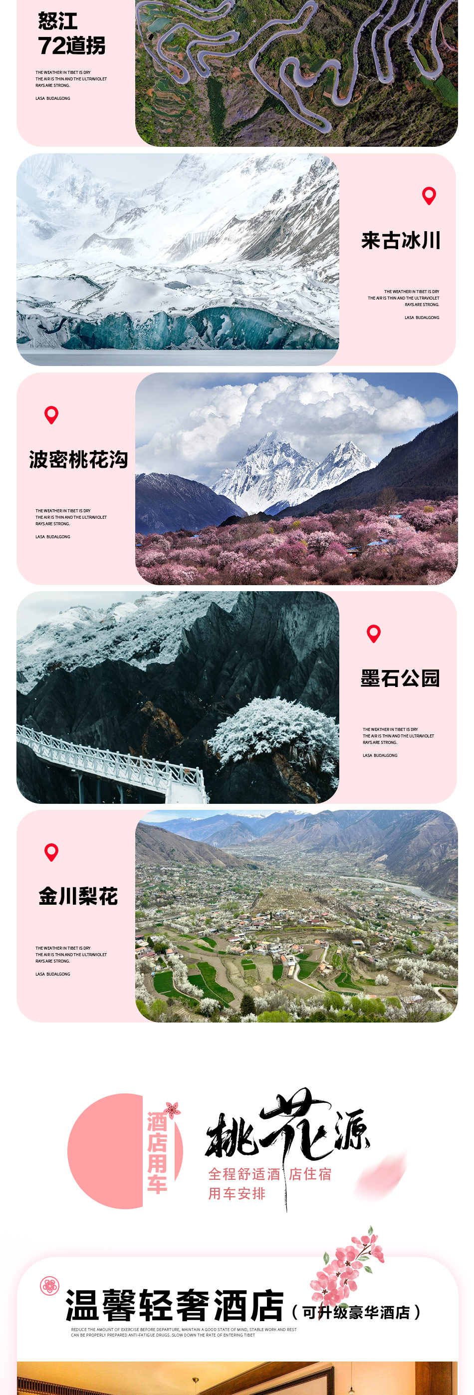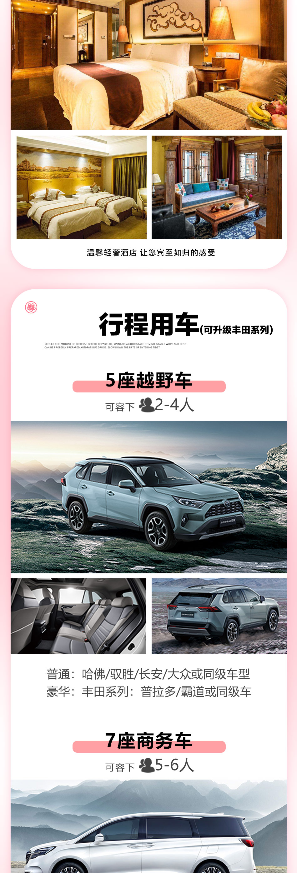 1.赠送:U型枕,随车配备矿泉水(每人每天1瓶),便携式氧气瓶2瓶(不用不退)