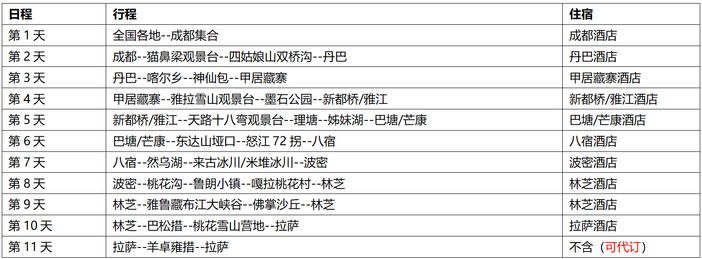 2.住宿:全程10晚标间住宿;酒店/民宿以标间为主(独立卫生间、WiFi、热水、电热毯,藏区条件有限,不能和城市相比,成都集合日酒店为赠送,不住不退不换)(单房差:单男单女我方尽量协调与同性游客拼房,若无法拼房,游客房差自理);