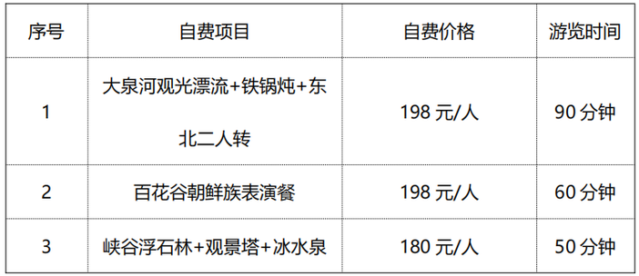 1、行程不含景区小交通费用: 摆渡车 35 元/人、环保车 85 元/人、倒站车 80 元/人【长白山景区必坐随团费一起收取】