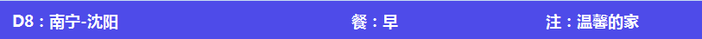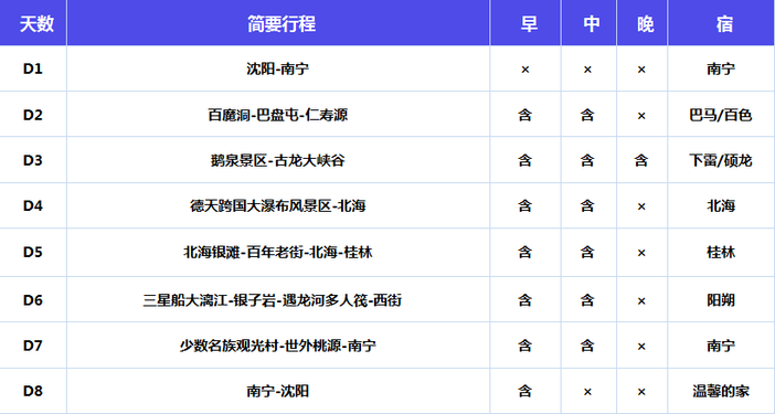 1.交通:沈阳-南宁往返飞机经济舱;北海桂林/桂林南宁往返动车二等座;当地空调旅游车(根据人数安排车型,保证每人一座;车辆由调度室调配使用,中途可能会出现调换,随身物品切勿放在旅游车座位上);
