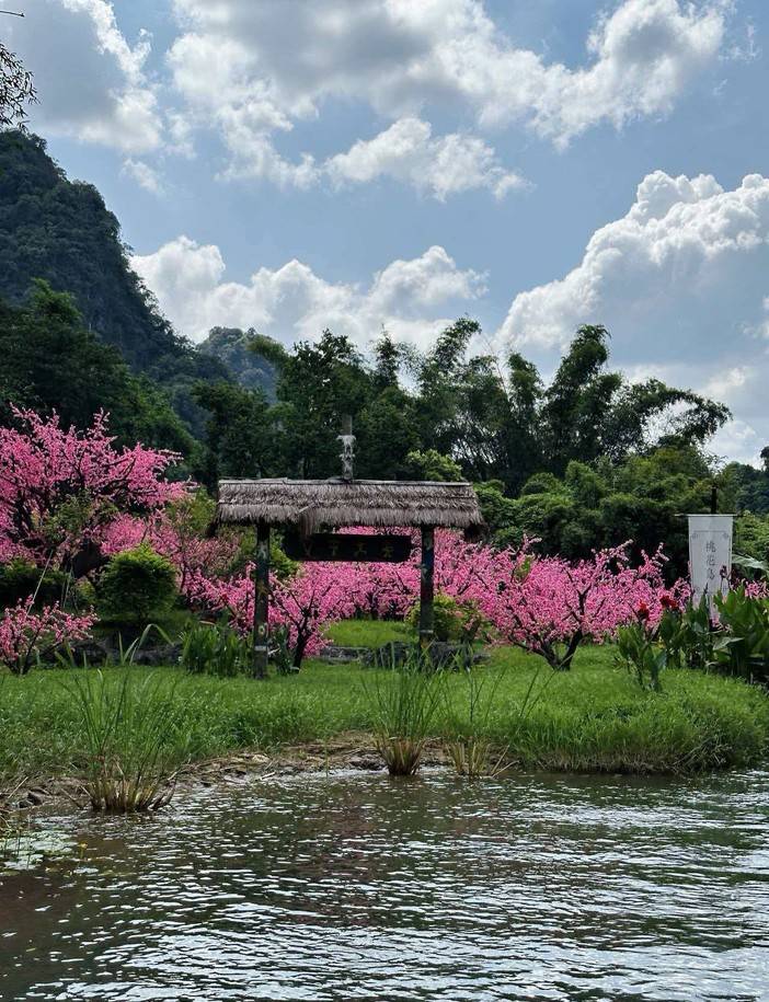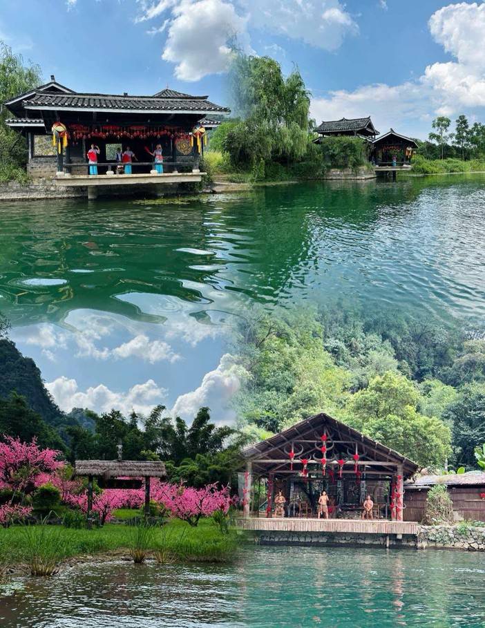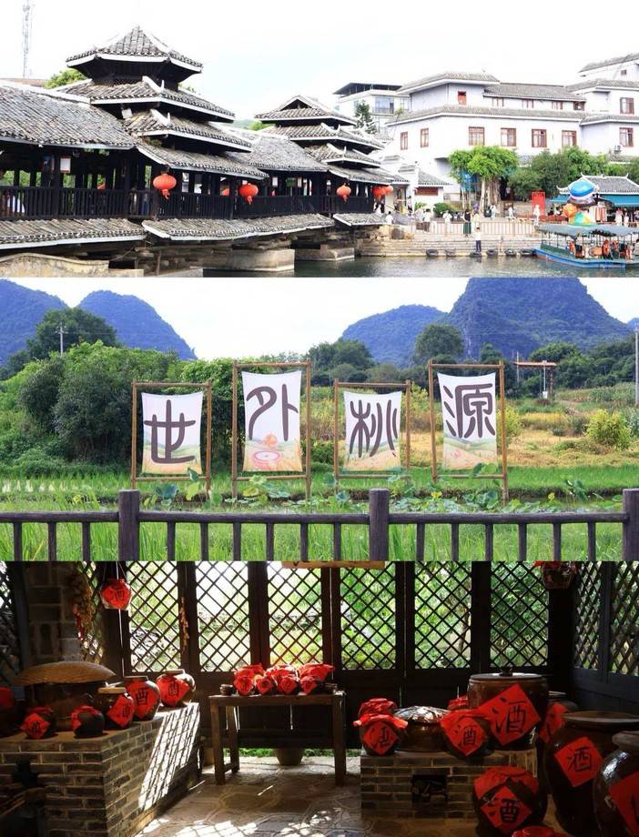 世外桃源景区位于广西阳朔西北约15公里处,这里是根据陶渊明所著《桃花源记》中描绘的意境,结合当地的田园山水风光所建的民俗风景园区。虽然是一处人造的景区,但这里的秀美风景以及营造的民俗风情都非常吸引人。脉脉青山、潺潺流水、云卷云舒、倒影水中、水天相一;特色民族建筑,坐立湖畔,田园村落,依稀可见,在世外桃源里,远离都市喧闹,环绕在周围的是青山、绿水、清新的空气,优美的歌声和欢快的舞蹈,以及人与人之间淳朴的诚恳相伴。