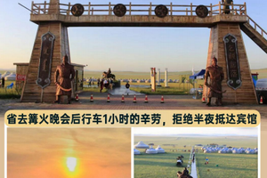 早集合后前往扎鲁特旗“中国最美山地草原”【车览】享有“中国最美山地草原之称”连绵的山川下,连绵的山川下,清澈的小溪在欢快流淌,远处的蒙古包就像飞落的大雁一样镶嵌在草原上,尽赏科尔沁草原风光。水草丰满,空气清新,风景优良,令人舒畅,看着眼前这样一片壮丽辽阔的草原,大家便能够感受到草原带来的非凡魅力了。据悉这片扎鲁特山地草原乃是曾经辽代誉洲古城将士驯养战马的地方,因此也叫作军马场。对于战马的要求有多高,这里的草原环境就有多好,一望无际的平原草场上,最适合马儿无忧无虑的肆意奔跑了。山川和草原只见连绵起伏,独特的自然景观还有人文景观更是令所有观赏的游客震撼非凡,回味无穷。远处苍劲有力的马头琴声伴随着阵阵的清风传来,每一缕音符的似乎也在诉说着历史的故事。午餐后游览【野狼谷景区】赠送玻璃栈道零距离观赏草原狼主要以草原狼为主,这里有 200 亩野生放养区,20 亩小狼驯化基地,这里散养着 38 匹野狼。野狼谷景区饲养的动物还有草原雄鹰、雕、旱獭、大雁、天鹅等。在野狼谷,你可以乘车观赏狼群或者喂食,近距离感受“狼”的习性和文化;后前往【兵团小镇】在乌拉盖草原深处有这么一处镌刻着兵团记忆的小镇,这里保存着兵团时期的建筑,传承着薪火相传的兵团精神,这里就是原内蒙古生产建设兵团六师五十一团团部所在地——乌拉盖哈拉盖图农牧场兵团小镇。走进兵团小镇仿佛让人们回到了那个年代,青灰色的墙体,古朴的门窗,激昂的标语,到处都是属于那个年代的时代烙印,兵团司令部、邮局、兵团礼堂,依稀可以看到那段历史所留下的痕迹。在兵团文化展厅门前的红旗广场上,游客们可以在各式具有兵团文化特色的标语和雕塑前拍照“打卡”。【乌拉盖湖】乌拉盖湖历史文化悠久,旅游资源丰富。水库区具有花草茂盛、天高云淡、景色优美、气候宜人等草原生态旅游特色。天鹅、大雁以及各种水鸟时起时落,库区周围野花遍地,蘑菇、黄花、芍药随处可见,是休闲避暑疗养的最佳选择地。在这里,曾经还拍摄过一部电视系列片《走进乌拉盖河》。影片用史诗般的情景展现了乌拉盖河流域的人文历史、风土人情、自然风光以及当地社会和谐稳定、人民安居乐业的良好局面,让乌拉盖湖名声大震。环湖路游览【在水一方】【金花滩】享有“小九曲湾”之称的参观草原上的季节性河流乌拉盖河,环绕在高尧乌拉山脚下,河北岸湿地草原平坦如画,河南岸怪柳丛生幽深恐怖,游客到此无不止步。乘车前往“爸爸去哪儿”拍摄地【乞颜蒙古部落】到达景区,接受草原的迎宾礼,感受草原的最高礼节接受蒙古人款待贵客的最高礼节--【草原迎宾-下马酒仪式】敬献下马酒,奉上蔚蓝的哈达,欢迎远道而来的客人。