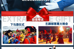 ★ 草原特色游乐项目:【蒙古大型情景剧-乞颜传奇】(约 45 分钟)情景剧,让您回到千年前的蒙古草原,了解草原上各大部落为了部族间利益的战斗,一对淳朴的蒙古族情侣演绎着他们爱情的悲欢离合;大型马战:多名蒙古族勇士为了保护自己的家园捍卫自己的爱情,提起战刀跨上战马,与敌人厮杀的震撼场面;