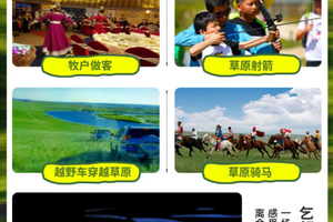 ★ 草原特色游乐项目:【草原那达慕】(约 30 分钟)赛马表演,赛马是蒙古族男儿三艺之一,比赛开始在众人的欢呼声中扬鞭策马,竞相追赶,观看者欢呼鼓掌,先到达终点的为胜者!马术表演:一起领略马背上的蒙古民族人马合一,蒙古人与蒙古马的配合无缝衔接,马背上的惊险动作让眼帘应接不暇。博克比赛:意为摔跤,它是蒙古族"男儿三艺"之一,属蒙古族传统的体育项目。搏克--蒙古语,是结实的意思,"攻不破、摔不烂、持久永恒"。它在13 世纪在我国建立举世闻名的大元帝国的蒙古族先进文化的结晶。