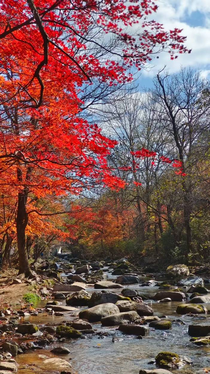 洋湖沟,是”中华枫叶之路“最美的一段。上世纪九十年代,已有大批画家追寻美景,爬山涉水来到比写生,故又称为“画家村”。远看漫长山遍野,颜色各异的红叶高低错落很是好看,尤其在靠近水边有倒影的地方,好像是画中画一样,仿佛在本已作好的油画里又凭空增添了想像的空间,一旦置身这段画廊般的山路,树影山色带给你的感觉可以说极为震撼,让你的心也随之沸腾。