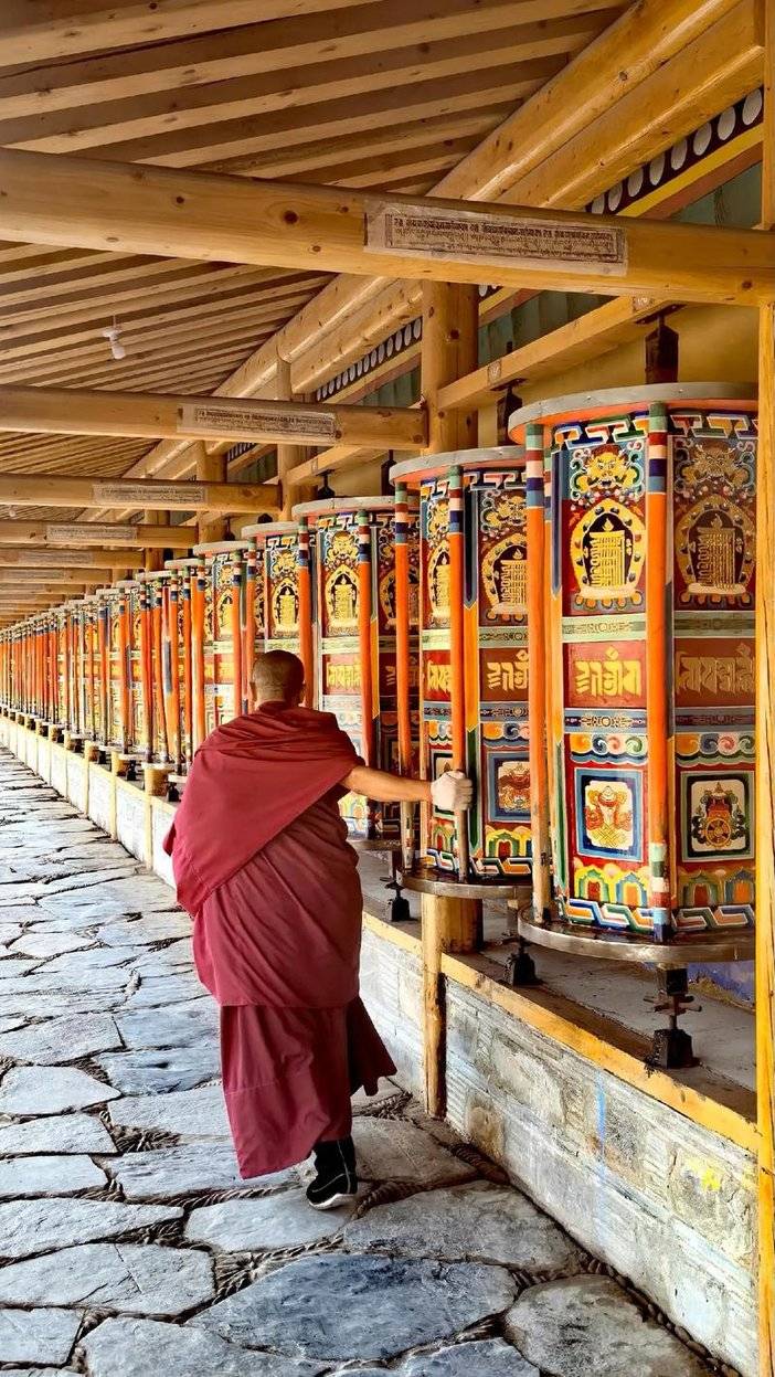 下午来到“世界藏学府”【拉卜楞寺】。寺院规模宏大,这里有恢宏的寺院建筑群,供奉着无数的巨大佛像和各种精美的雕塑、壁画、法器等。拉卜楞寺超长的转经长廊是全世界罕见的,共2000余个转经筒,转遍每个转经筒至少需一个小时。一般游览拉卜楞寺的方式都是顺时针绕寺一圈,这也是藏传佛教的朝圣仪式。在拉卜楞寺西南角有座古老的木桥,横跨夏河,过桥上山,站在晒佛台上能将拉卜楞寺的全景尽收眼底。带给他的信徒以平安与圆满。感兴趣的小伙伴可以沿着转经长廊推转经筒,感受藏民文化。