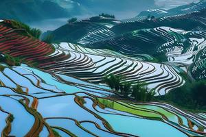 元阳老虎嘴梯田位于云南省红河哈尼族彝族自治州元阳县境内,是元阳哈尼梯田核心景区之一。该梯田分布于深谷间,状如花蕊,总面积达3000多亩。其地势险峻,海拔落差最高达2000米,梯田级数最多可达3700级,形成直落河谷的立体景观。