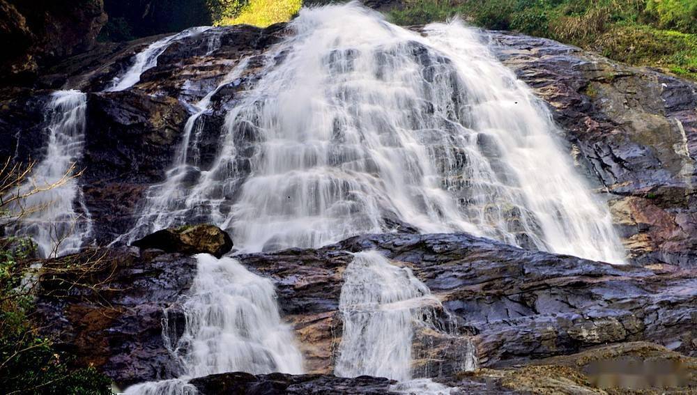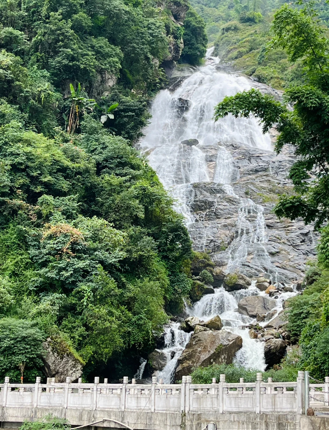瀑布落差超百米,呈多级阶梯状跌宕,水流湍急。丰水期时,瀑布如咆哮巨龙,水声轰鸣;枯水期则化作飘逸玉带,温柔缠绕山间。瀑布周围悬崖峭壁、奇岩异石林立,水雾弥漫时常见彩虹悬空,景色壮丽。