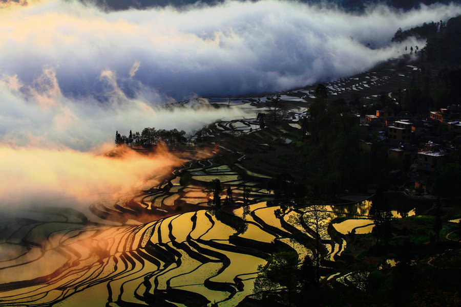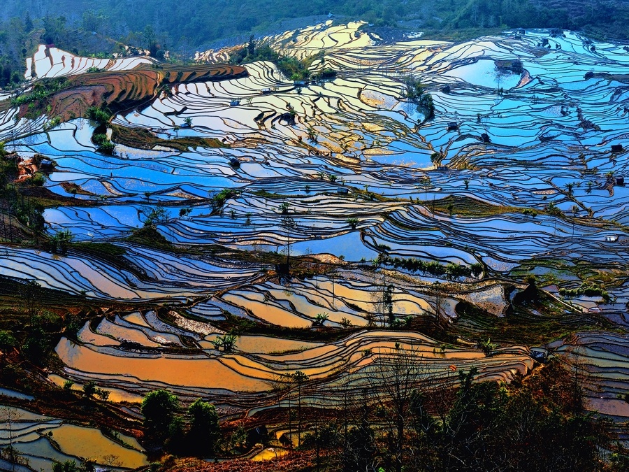 早餐后约2小时30分钟车程抵达元阳梯田核心景区,轻徒步,漫步梯田中央,哈尼人在哀牢山里千年雕刻的梯田,就在脚下远处延升,镜面搬的田面里反射着霞光,笼上暖暖的金色,衬托出柔美的曲线,感受人与自然的鬼斧神工。