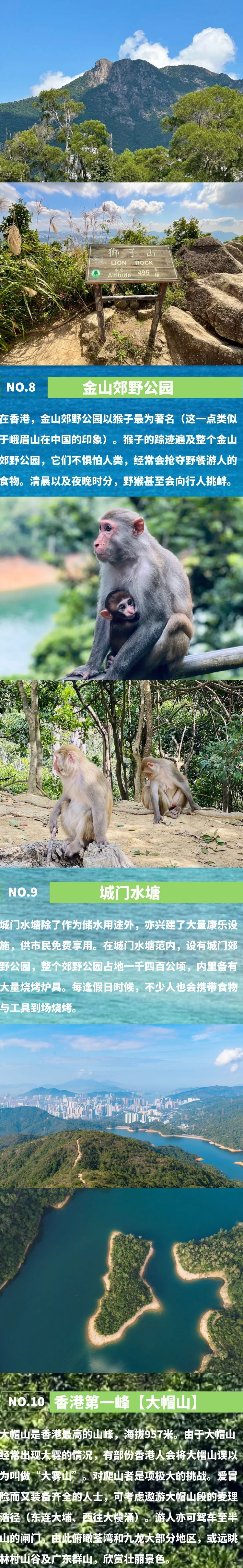 用餐:自理 交通:酒店-起点交通 回程自理 住宿:香港四星酒店 徒步&爬升:20 km 累计爬升1378米08:00 乘车前往6段起点 08:30 领队带领热身后开始徒步,今天挑战6、7、8段,也是香港的一条越野跑拉练线路之一的“针草帽”,也是较为辛苦 10:00 到达六段终点【城门水塘】,此处有洗手间和自助售卖机,小伙伴们可以自行补给 11:00 翻过532米的【针山】 12:00 到达七段终点【铅矿坳】,休息午餐 14:00 到达【四方山】,开始翻越香港最高峰大帽山 15:00 登顶957米【大帽山】,一路下山 16:00 到达筌锦公路,乘车返回酒店 17:00 自由活动